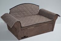 Pelíšek Leontina má podtočené boční opěrky a oblá záda a tím vytváří pocit prvorepublikové lenošky. Na tento typ pohovky se také skvěle hodí barevný přehoz tzv. čabraka, která navíc významně prodlouží její životnost. Ochranná čabraka se také dodává z koženky. Ta se zase osvědčí, když se váš miláček vrátí zablácený z venku... Zmíněné doplňky hodící se rozměrově k této sedačce najdete v sekci „doporučujeme…“ o kousek níže.